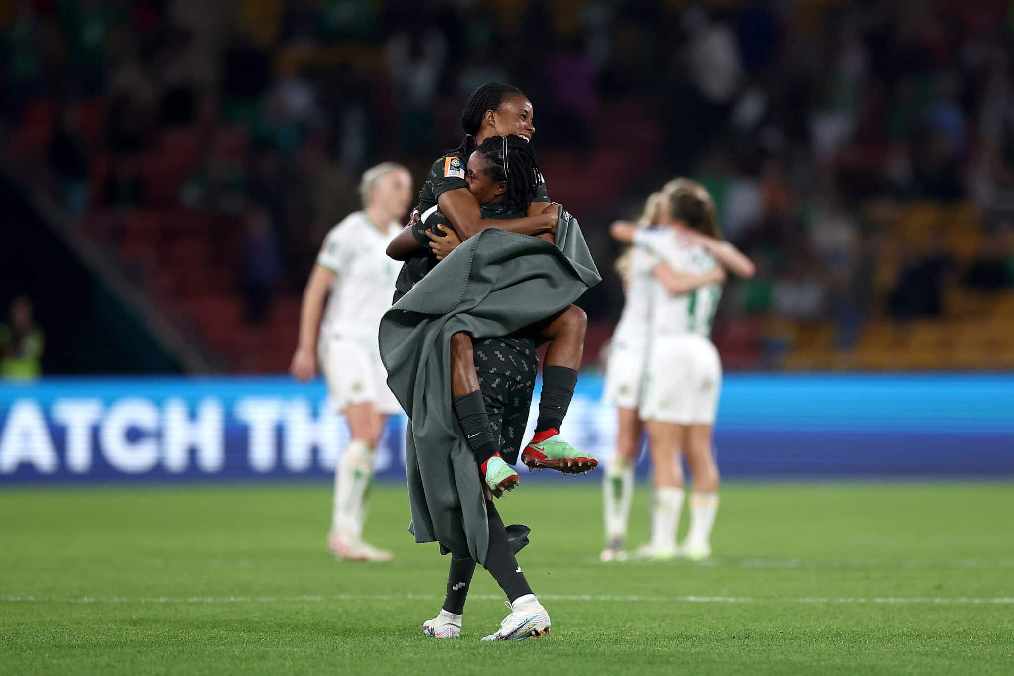 Super Falcons squad captain Onome Ebi embraces her teammate Halimatu Ayinde